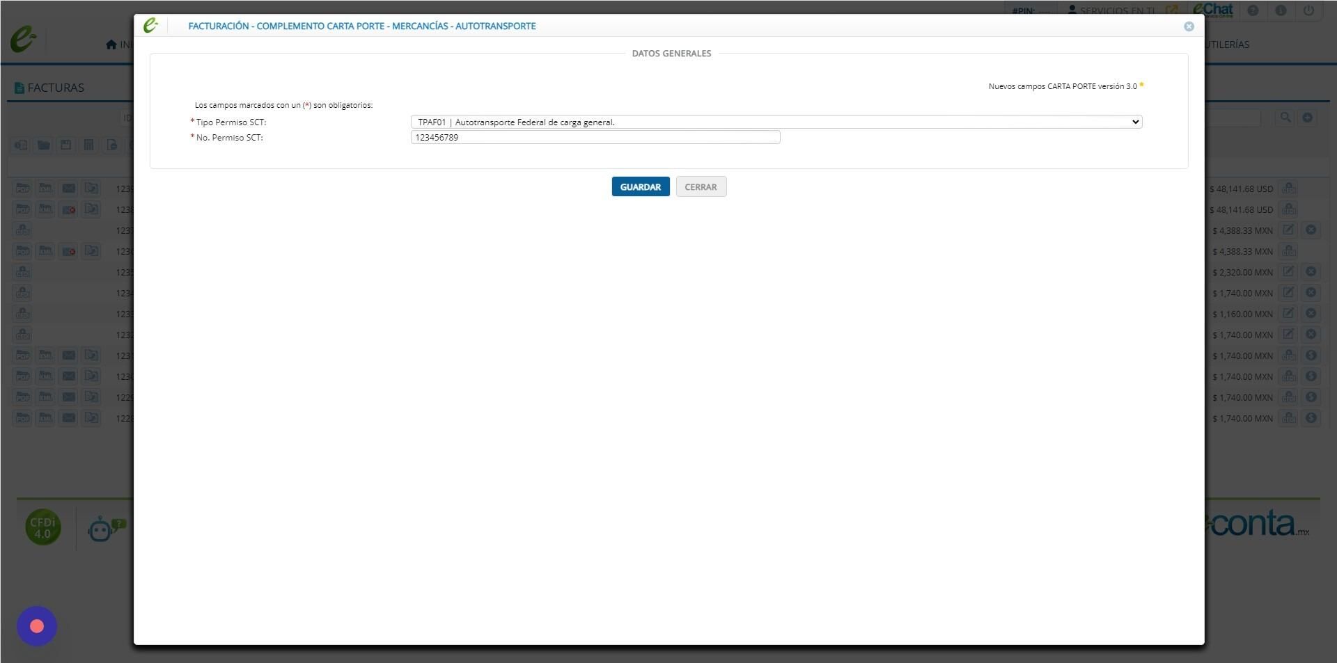 5. Al momento de actualizar la factura, se abre la ventana para llenar el complemento de carta porte. Los dos campos obligatorios que se deben de llenar son: