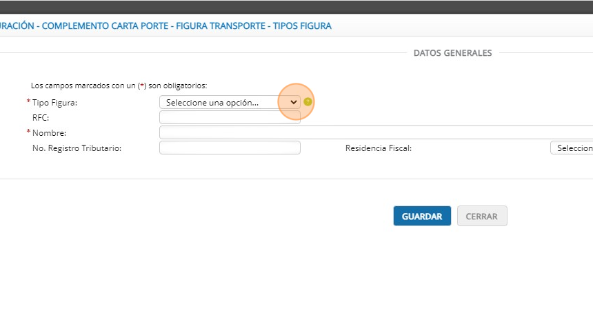 40. En el campo ¨Tipo Figura¨ se van a poder apreciar las 4 opciones que maneja el SAT para el llenado de la Carta Porte.
