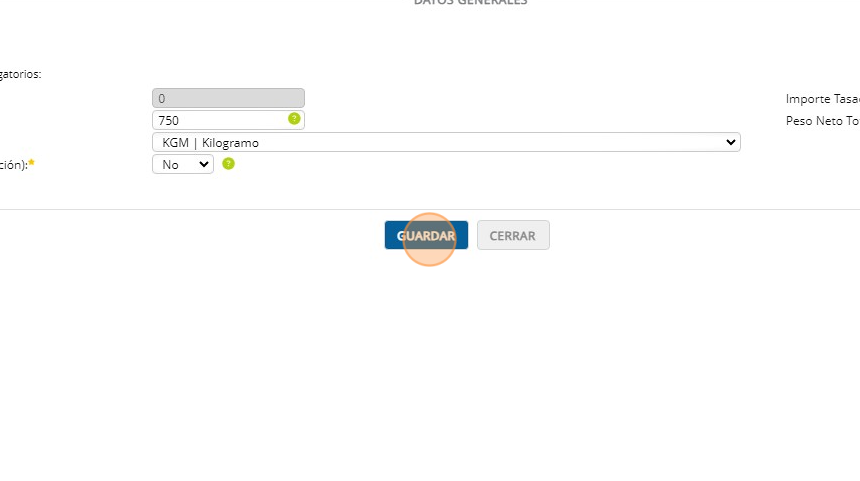 64. Ya que se hayan capturado los campos mas relevantes, es importante darle click al botón de GUARDAR para que se cree el registro de la mercancía capturado.