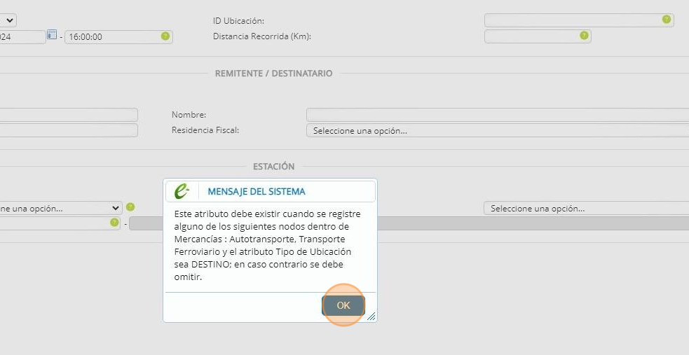 Tip: En la mayoría de los campos del complemento de carta porte aparecen varios iconos de color verde con el signo de interrogación. Es de suma importancia consultar estas opciones, ya que le ofrecen una descripción sobre en que consiste el campo y bajo que circunstancias se debe de capturar o que datos capturar. La forma para poder consultarlo es dándole click al icono de signo de interrogación para que se abra una ventana con el mensaje del sistema.