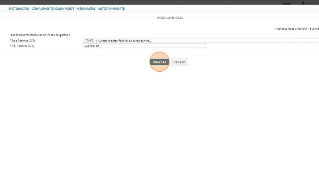 50. Ya que se hayan registrado esta información, es importante darle grabar para que seguir capturando la información de la carta porte.