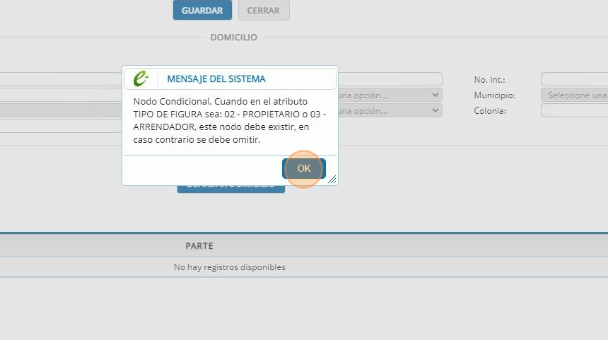 42. Ya que se haya registrado de forma exitosa la información, el sistema habilita las secciones de ¨DOMICILIO¨ y ¨PARTES TRANSPORTE¨.