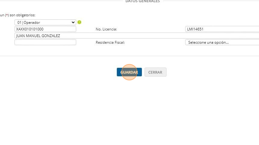 Tip: Al Seleccionar al tipo de figura, en este ejemplo el Operador, se habilitan los campos correspondientes. Si nuestro operador es nacional, solo es necesario capturar su RFC, que debe de ser el valido para el SAT, su no. de licencia y su nombre. Los campos de ¨No. de Registro tributario¨ y ¨Residencia Fiscal¨ solo se deben de capturar cuando la figura sea del extranjero. Por consiguiente, al ser nacional, estos campos no se deben de capturar. Si la figura que se esta registrando es del extranjero, en el campo de ¨RFC¨ se debe de capturar el registro fiscal del contribuyente del extranjero ¨XEXX010101000¨.