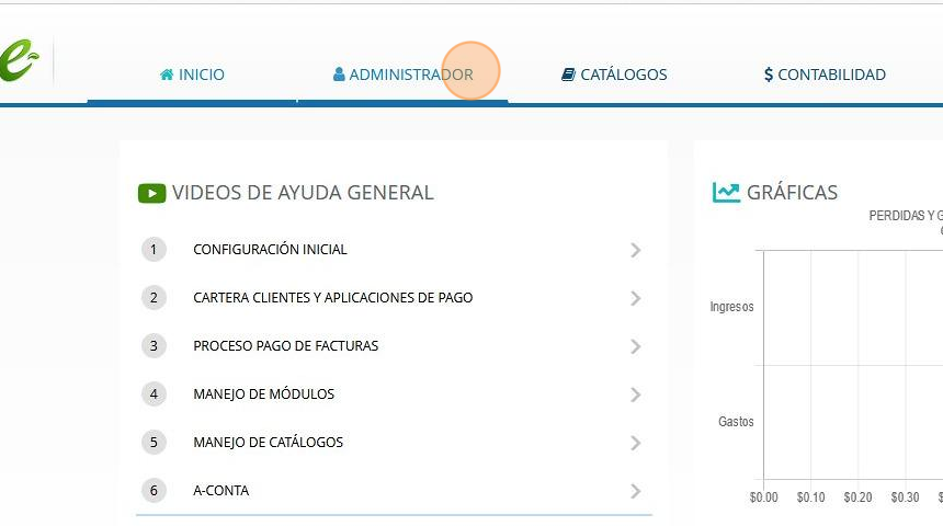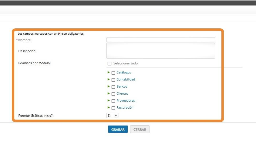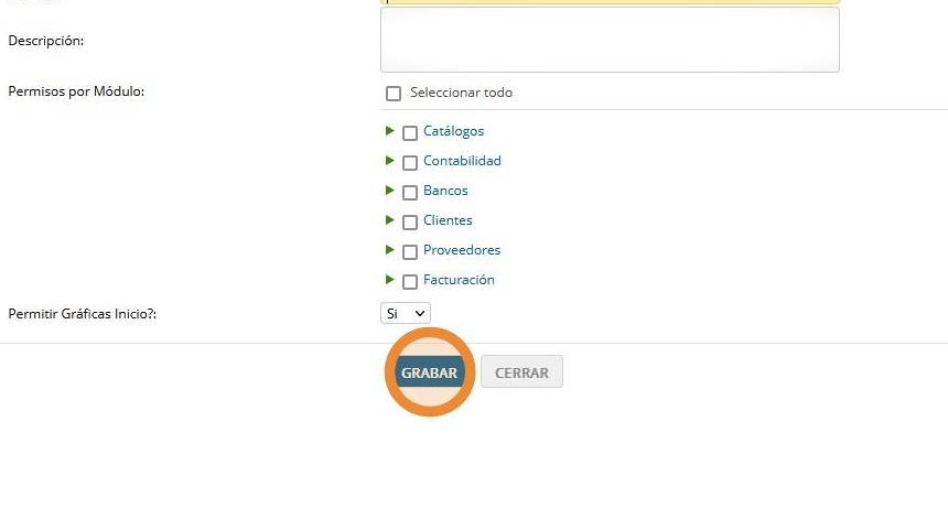Tip: En la página principal de e-conta.mx se muestran estadísticas e indicadores en forma de gráficas, existe la opción de evitar que se muestre la gráfica como parte de la configuración del rol.5. Una vez capturada la información, dar click en Grabar.