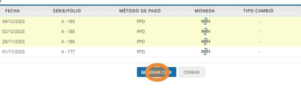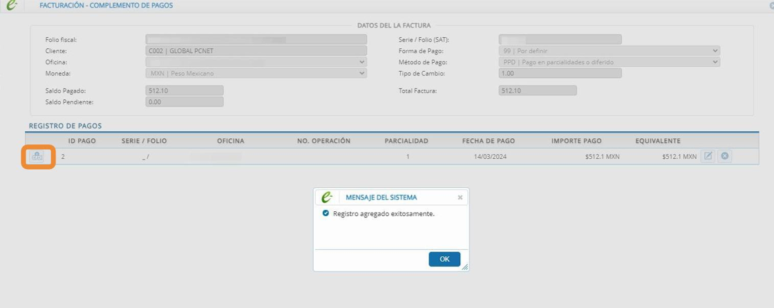 5. Dar click en el botón CFDI que se encuentra de lado izquierdo del registro del pago.