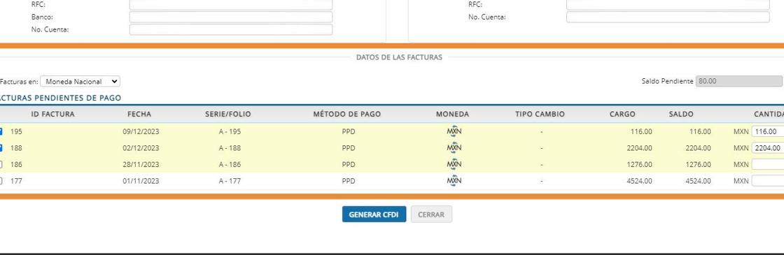 10. Seleccionar las facturas de las cuales desea realizar el complemento de pago y anotar la cantidad pagada de cada una de las facturas.