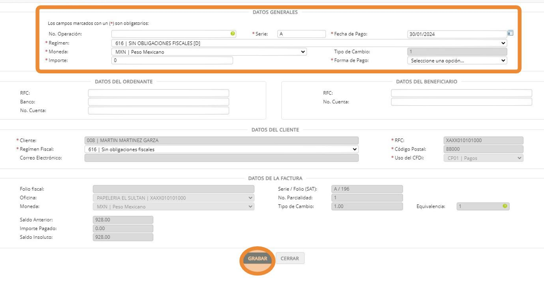 Tip: Para generar el complemento de pago la fecha de ingreso siempre deberá ser mayor a la fecha de la factura.