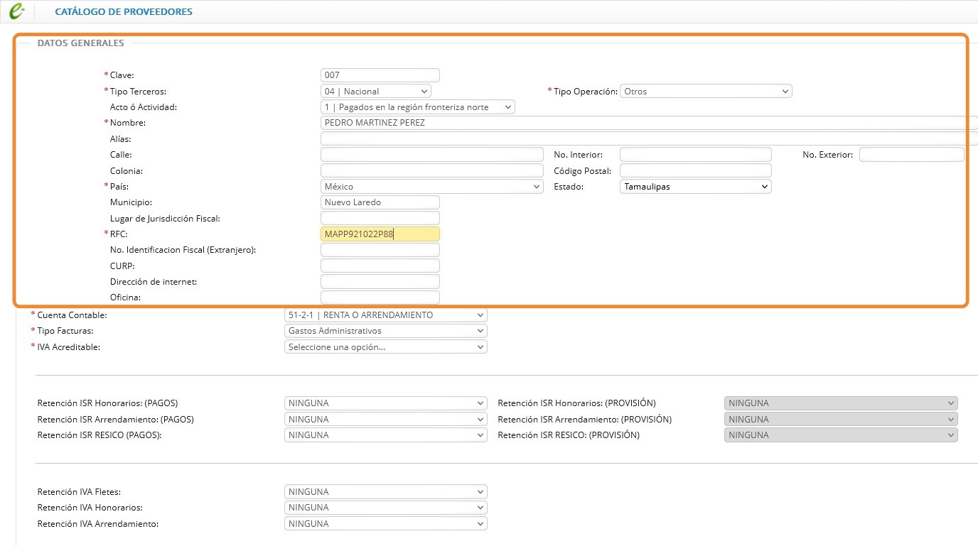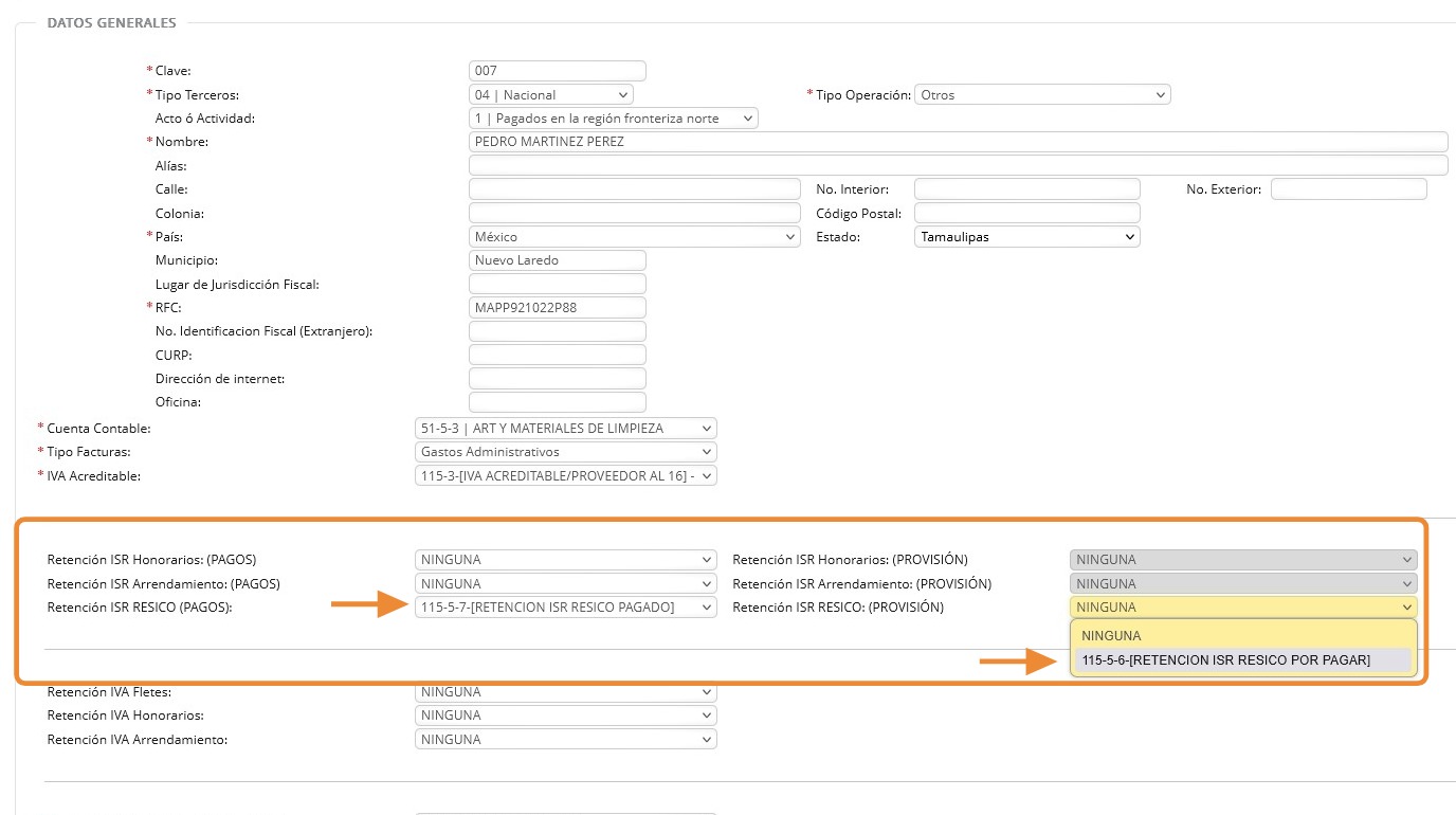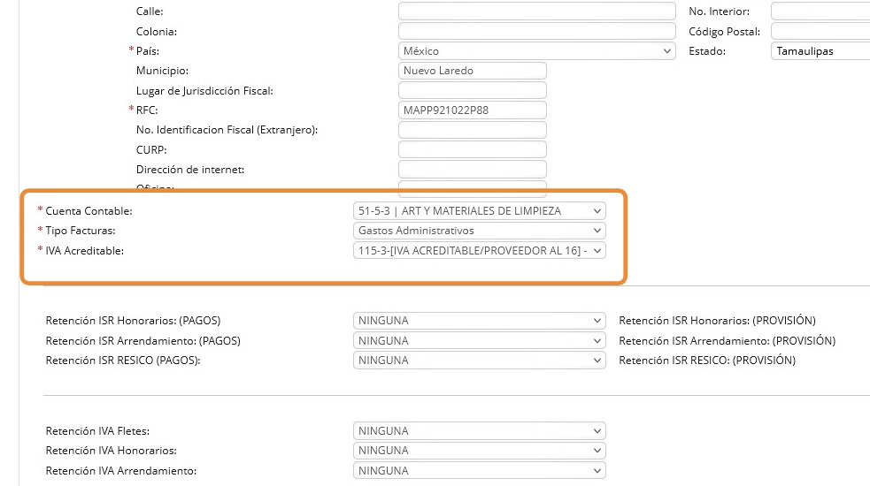 5. Si se cuenta con el modulo de contabilidad, seleccione la cuenta contable para configurar el gasto y el IVA que utiliza para el proveedor.